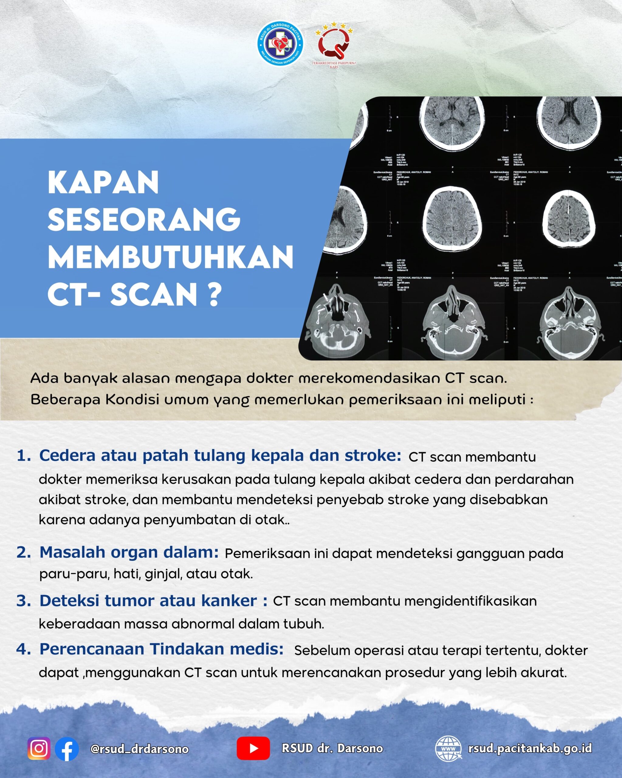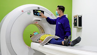 CT Scan adalah salah satu jenis pemeriksaan penunjang medis dengan menggunakan sinar X dengan bantuan operator yang dapat memeriksa jaringan tubuh sesuai dengan kebutuhan pasien misalnya: kondisi pembuluh darah, menilai tumor atau kanker, kasus trauma/cidera, menilai organ dalam, membantu proses biopsi jaringan atau proses drainase/pengeluaran cairan yang menumpuk di tubuh, dan sebagai alat bantu pemeriksaan bila hasil yang dicapai dengan pemeriksaan radiologi lainnya kurang memuaskan. |