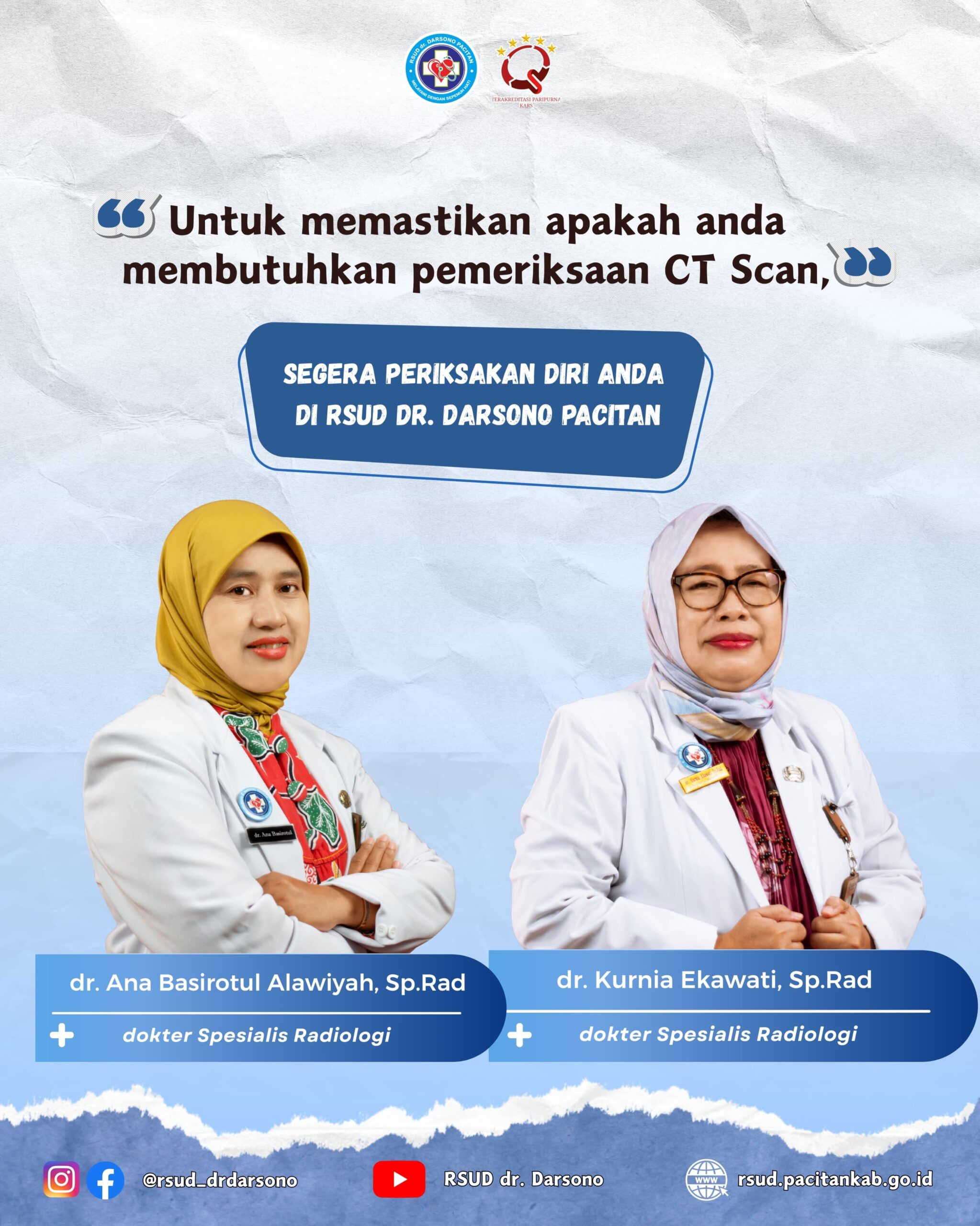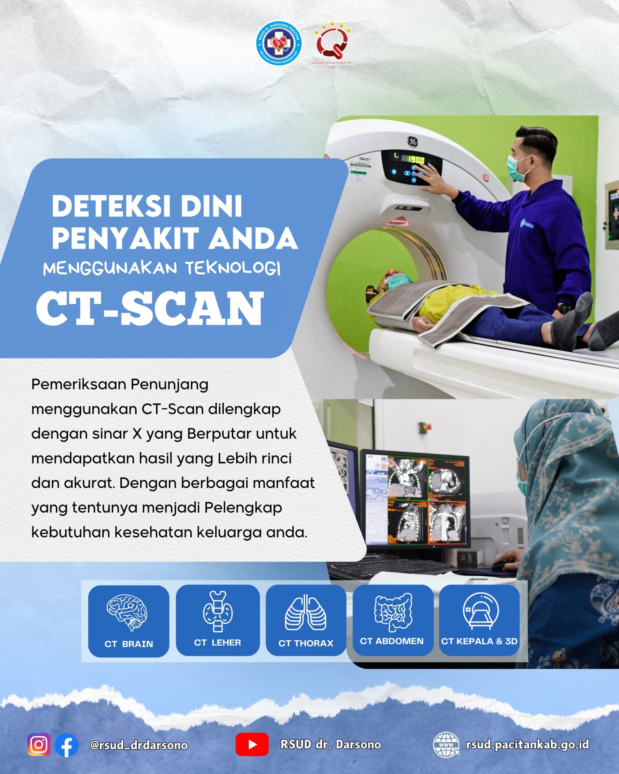 RSUD dr. Darsono Kabupaten Pacitan dengan dukungan Dokter Spesialis Radiologi dan Radiografer yang terampil dan berpengalaman serta ditunjang peralatan yang canggih sehingga dapat memberikan gambaran yang lebih informatif dalam membantu menegakkan diagnosa.