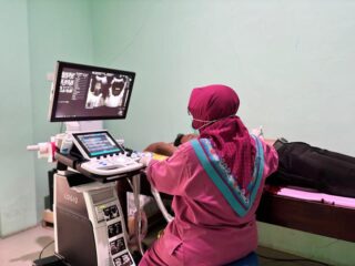 Pemeriksaan dengan menggunakan gelombang suara dan tidak mengandung resiko dari paparan sinar X. Pemeriksaan ini terutama dipergunakan untuk memperlihatkan kelainan-kelainan dalam rongga dada/thorax, testis, payudara, kepala, leher, dan berbagai organ gerak. | |