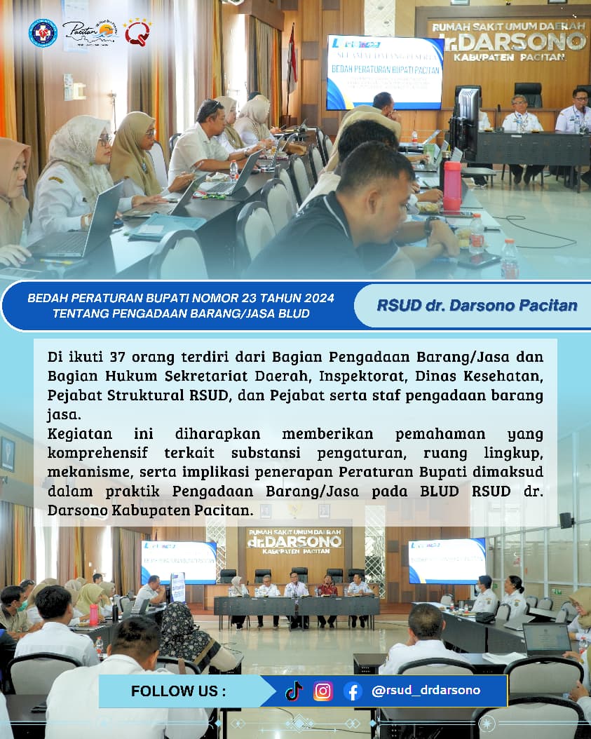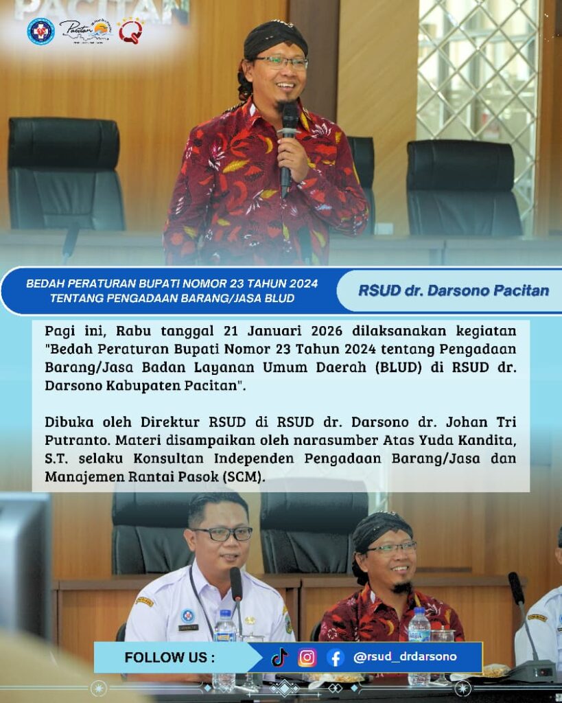 Pagi ini, Rabu (21/01/2026) dilaksanakan kegiatan Bedah Peraturan Bupati Nomor 23 Tahun 2024 tentang Pengadaan Barang/Jasa Badan Layanan Umum Daerah (BLUD) di Ruang Pertemuan RSUD dr. Darsono Kabupaten Pacitan Lantai 3.