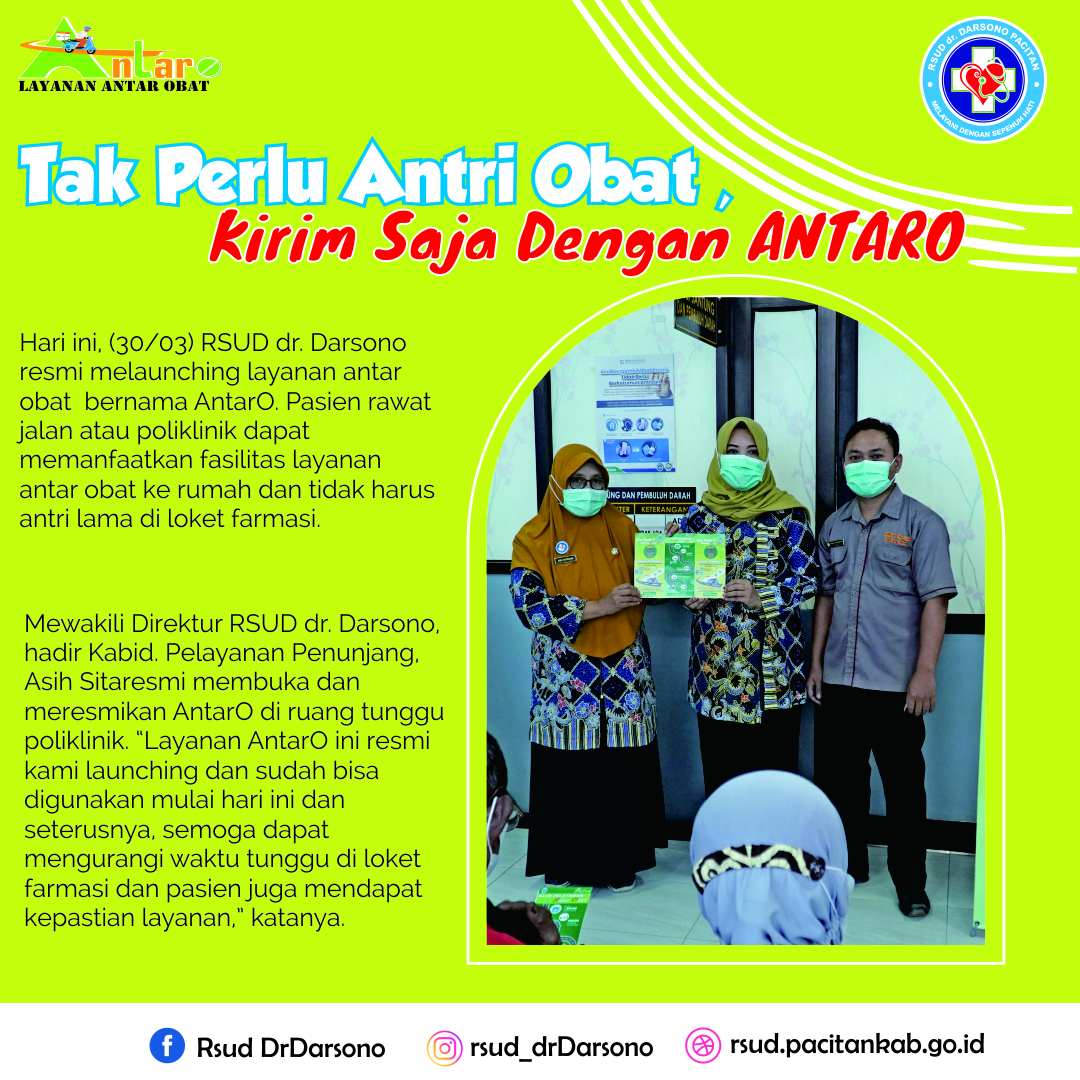 Layanan antar obat AntarO (Antar Obat) merupakan program layanan pengantaran obat RSUD dr. Darsono Kabupaten Pacitan untuk pasien rawat jalan agar pasien tidak perlu antri menunggu. Setelah obat diantar dan diterima akan dilakukan pengontrolan dan pengecekan obat via telepon oleh apoteker atau tenaga tehnik kefarmasian meliputi nama pasien, tanggal lahir, alamat, nama obat, jumlah obat, cara minum obat, dan petugas pengecekan juga bertugas mencatat di buku pengecekan layanan antar obat pasien rawat jalan.