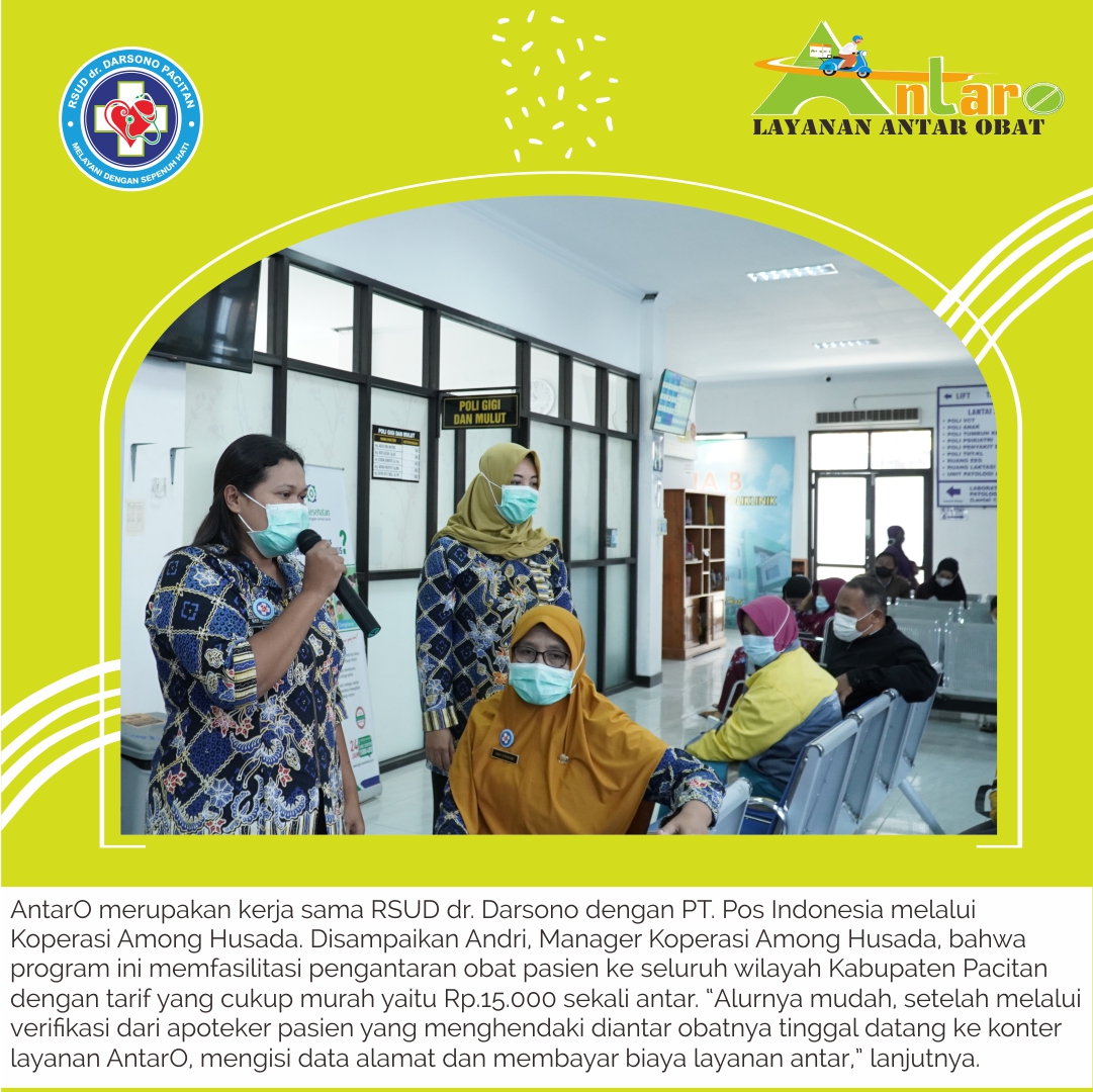 AntarO merupakan kerja sama RSUD dr. Darsono dengan PT. Pos Indonesia melalui Koperasi Among Husada. Disampaikan Andri, Manager Koperasi Among Husada, bahwa program ini memfasilitasi pengantaran obat pasien ke seluruh wilayah Kabupaten Pacitan dengan tarif yang cukup murah yaitu Rp.15.000 sekali antar. “Alurnya mudah, setelah melalui verifikasi dari apoteker pasien yang menghendaki diantar obatnya tinggal datang ke konter layanan AntarO, mengisi data alamat dan membayar biaya layanan antar,” lanjutnya.
