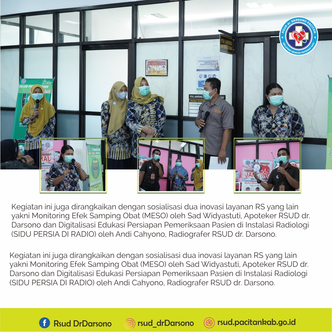 Kegiatan ini juga dirangkaikan dengan sosialisasi dua inovasi layanan RS yang lain yakni pelaporan efek samping obat oleh Sad Widyastuti, Apoteker RSUD dr. Darsono dan Digitalisasi Edukasi Persiapan Pemeriksaan Pasien di Instalasi Radiologi (SIDU PERSIA DI RADIO) oleh Andi Cahyono, Radiografer RSUD dr. Darsono.