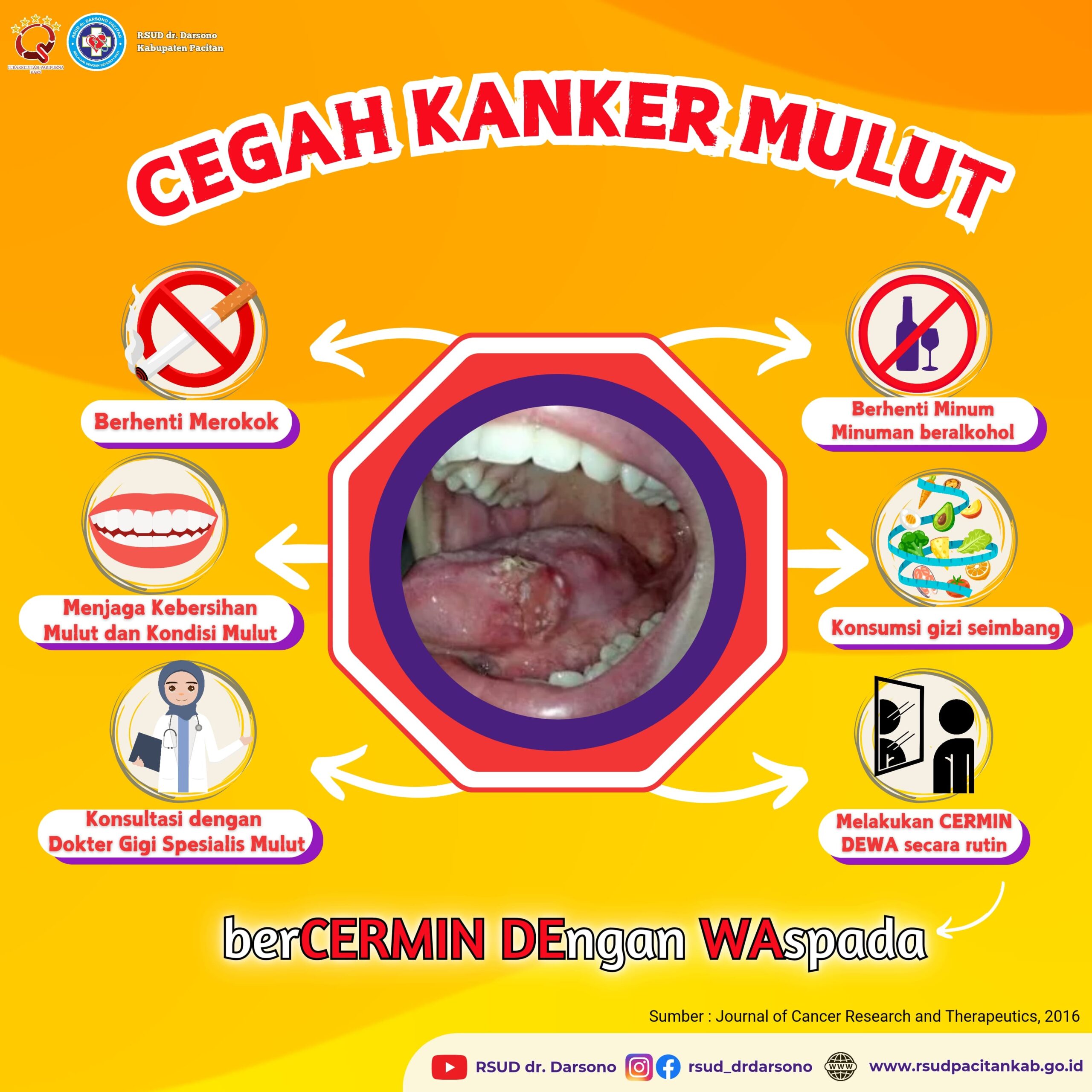 Kita dapat mencegah terjangkit kanker mulut salah satunya dengan menjauhi beberapa faktor yang dapat meningkatkan risiko seseorang untuk terkena kanker mulut. Salah satu cara termudah untuk mencegah Kanker Mulut adalah dengan rutin melakukan CERMIN DEWA setiap sebulan sekali. CERMIN DEWA merupakan singkatan dari berCERMIN DEngan WAspada. Untuk lebih lengkapnya silakan cek Youtube RSUD dr. Darsono dengan keyword “Cermin Dewa RSUD dr. Darsono” ya sedulur. Apabila anda menemukan gejala Kanker Mulut segera periksakan diri anda ke Poliklinik Penyakit Mulut RSUD dr. Darsono Kabupaten Pacitan.