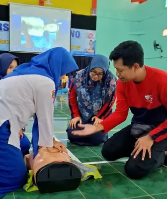 Selanjutnya, sebagai narasumber, dr. Ike Dyah Pambayun, Sp.JP (Dokter Spesialis Jantung dan Pembuluh Darah RSUD dr. Darsono) memberikan edukasi tentang jantung sehat dan pelatihan Bantuan Hidup Dasar (BHD), disertai praktek langsung oleh siswa-siswi SMKN 2 Pacitan dipandu tim dari RSUD.